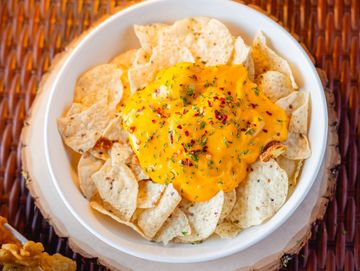 Crispy Tortilla Chips Topped with Diced Chicken Breast, Cheese Sauce, Sweet Corn, Diced Bell Pepper, Tomatoes.