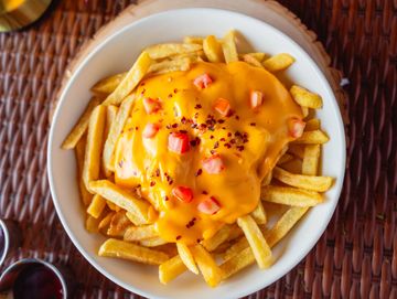 French fries Topped With Cheese Sauce, diced onions, Diced Bell Pepper & Chicken Breast.